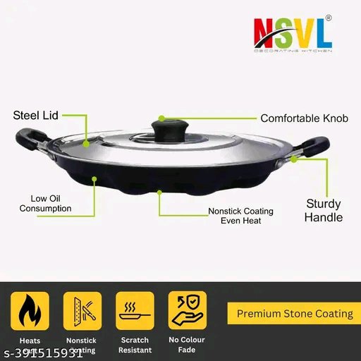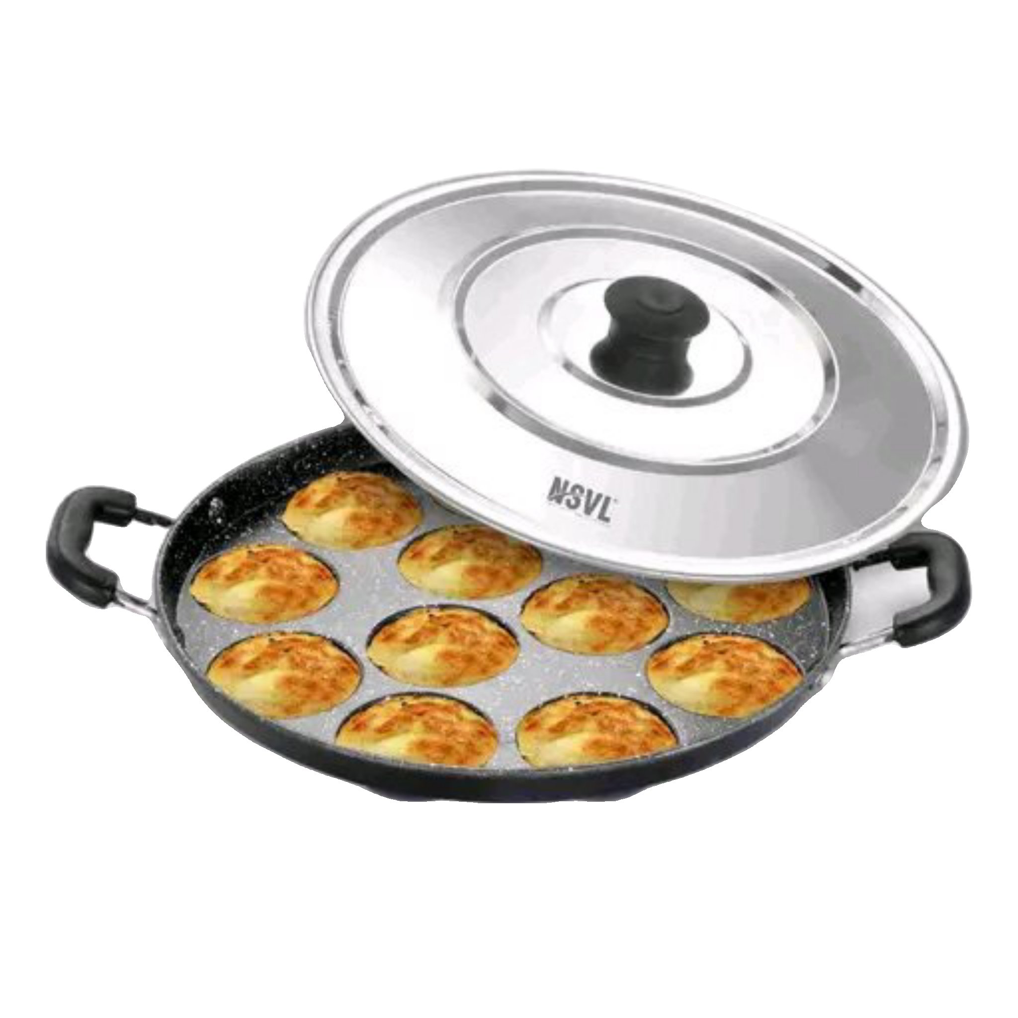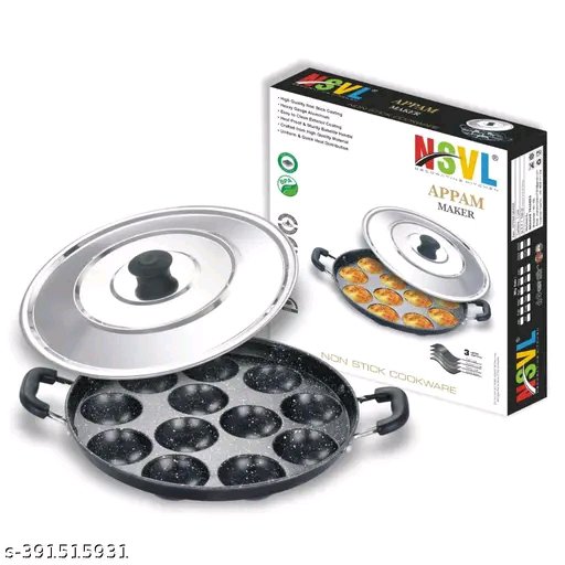Name: Non Stick 12 Cavity Appam Patra Handle with Lid, Paniyarakkal | Paniyaram | Appam Pan with Silicon Brush